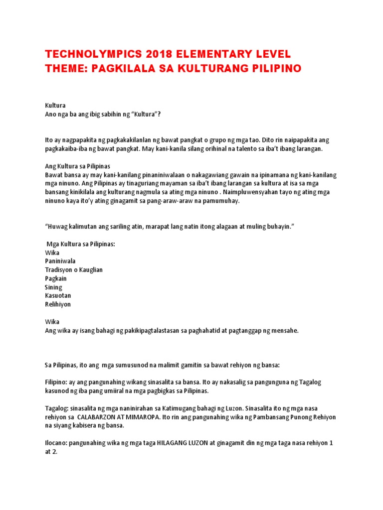 Technolympics 2018 Elementary Level Theme Pagkilala Sa Kulturang Pilipino