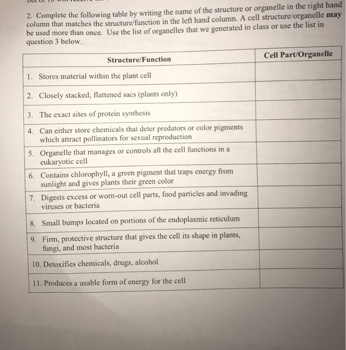 Cell Organelles Worksheet2 Cell Organelles Worksheet Use The Table Above To Fill In The Chart Complete The Following Table By Writing The Name Of The Course Hero